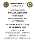 tickets at face value with no tax or service charges. An official announcement with further details will be made at our March business meeting. As a reminder, please notify either myself or James if you or a memberof your family is ill. Mention will be made at each business meeting so that our Legion family can offer support and keep you in our thoughts and prayers. Thank you to all members who continue to support Post 19 by remaining current and in good standing through the payment of annual dues. Your commitment keeps